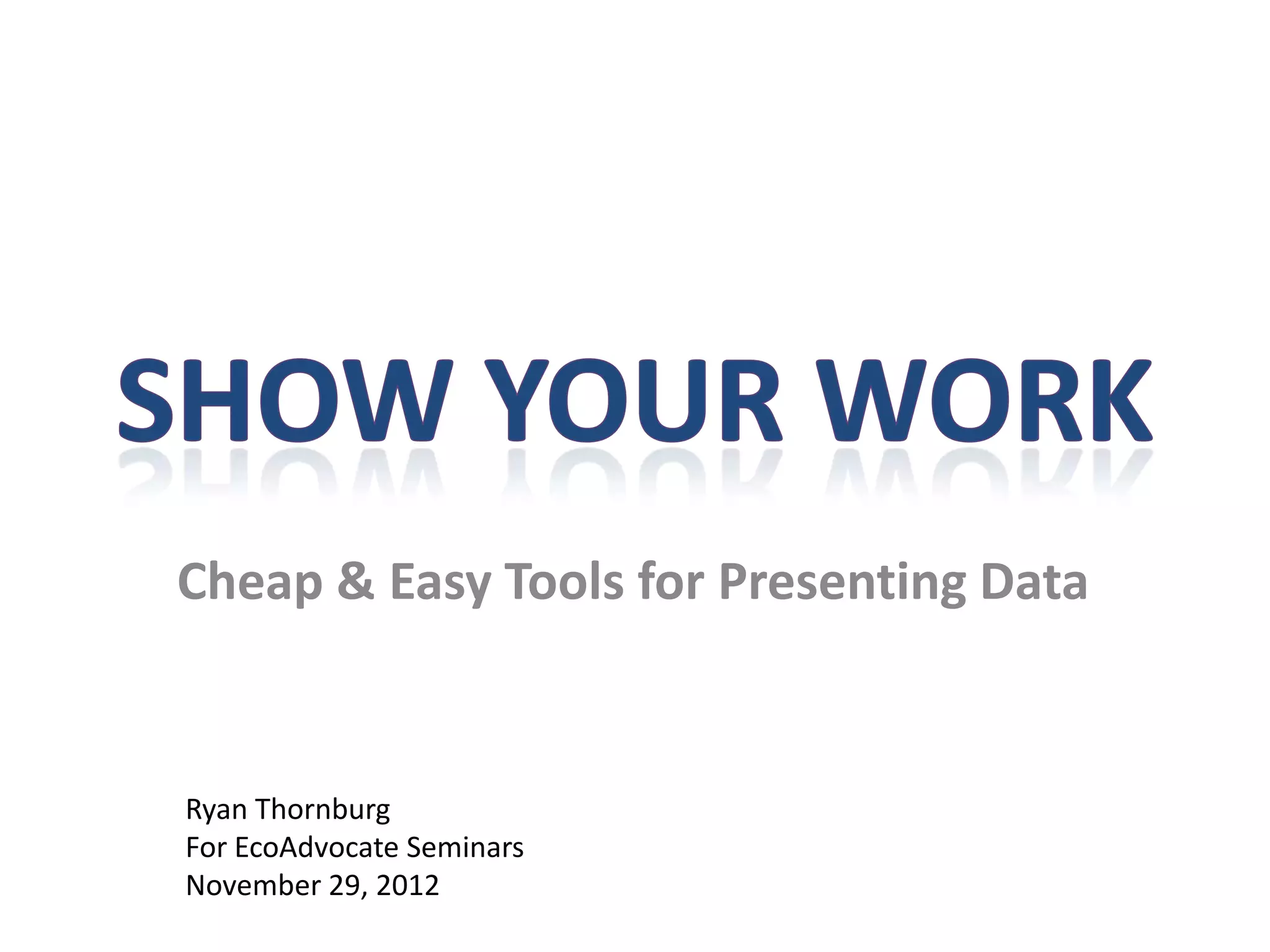 This document provides recommendations for cheap and easy tools for presenting data, including using H.264 video codec at 1280x720 resolution and 3000-5000 kbps bitrate for optimized download of videos. It also recommends audio codec of AAC at 128 kbps stereo and lists websites like Scribd, DocumentCloud, and Google Docs that allow uploading documents to share data on websites.