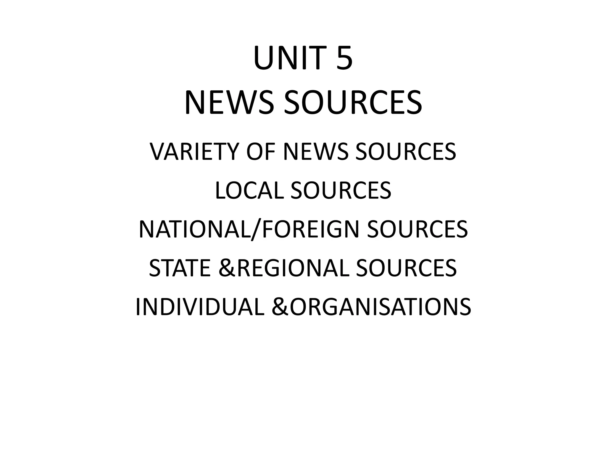 This document discusses different types of news sources that journalists use. It identifies two main categories of sources - external/identified sources that are publicly available like press conferences, and informal/confidential sources that journalists cultivate personally through contacts and insiders. These informal sources provide exclusive information but require protecting the identity of the source. Journalists must verify information from all sources and protect their right to not disclose confidential sources.