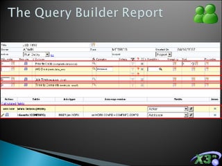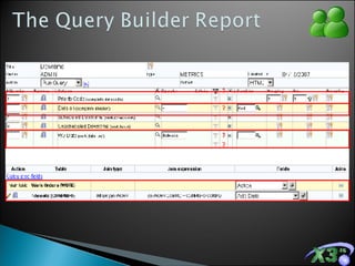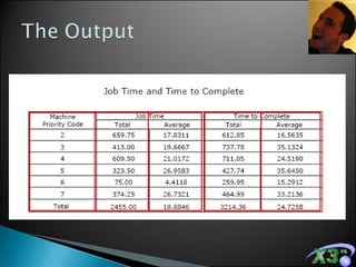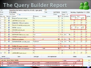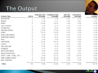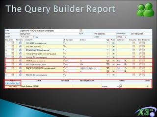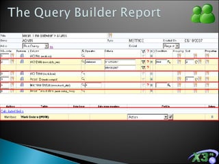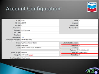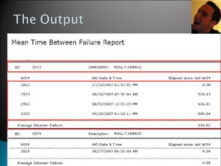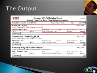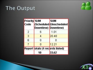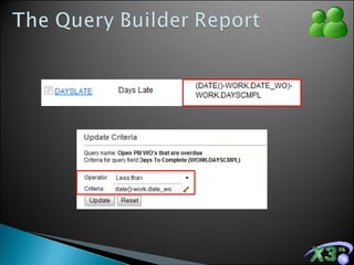 The document discusses requirements from two clients for customized reports in a computerized maintenance management system. For a manufacturing facility, the clients wanted reports on downtime by division, mean time between failures, and time to complete work orders. For a performing arts center, the client needed a report on overdue preventative maintenance work orders and their allowed completion times. The system was customized by adding relevant fields to work orders and reports to meet the clients' output needs.