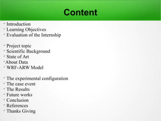 This document summarizes an internship project using the WRF-ARW model to simulate a tropical cyclone. The internship involved learning UNIX, WRF installation, configuration and running a simulation of Tropical Cyclone HudHud without data assimilation. The results showed the model predicted the cyclone track closely compared to observations. Future work proposed using more cyclones and assimilating Doppler radar data to evaluate impact on track and intensity forecasts. The internship provided valuable experience in operational forecasting and research using numerical weather prediction models.