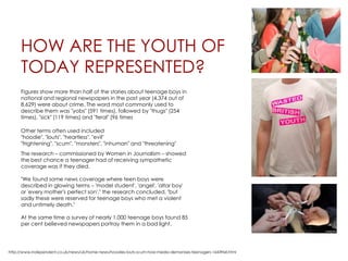 The document discusses how UK newspapers negatively portray teenage boys, often describing them with demeaning terms like "yobs", "thugs", "sick", and "feral". Research found over half of stories about teenage boys were about crime, and they were rarely described sympathetically unless they had died. In contrast, the response discusses positively representing youth in a magazine by portraying them as fun-loving but relaxed, through calm images that show their artistic, individual personalities and challenge stereotypes.