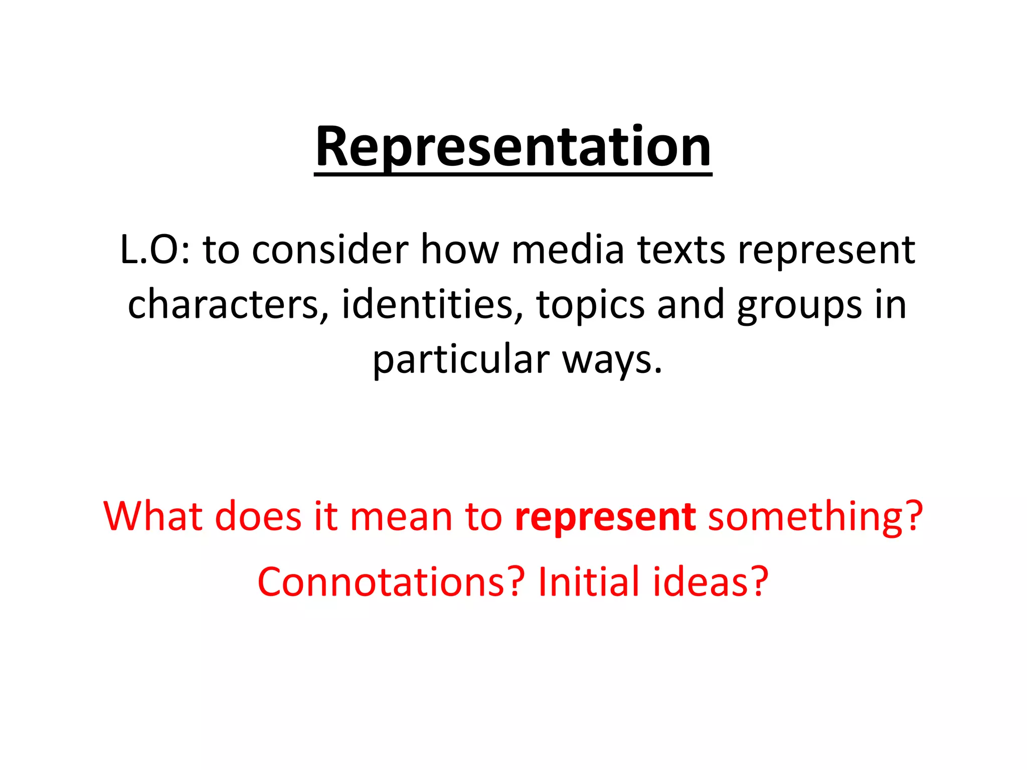 The document discusses how media texts represent characters, identities, topics and groups through re-presentation rather than a mirror image, using certain ideologies, beliefs and values. It provides questions to consider when analyzing representations, such as who produced the text, who is being represented and how, why specific representations were selected, what has been left out, and who holds power. The document also gives tips for deconstructing representations and discusses several theories of representation, such as stereotypes, hyperreality, character tropes, and binary opposites.