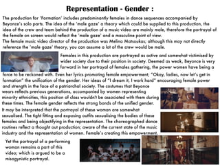 Beyonce's 2016 music video "Formation" addresses issues of representation of black people, women, LGBTQ+ community, and culture. Set in New Orleans, it references Hurricane Katrina and black southern culture through imagery. It features black women in positions of power and natural hair to celebrate black femininity. Ultimately, the video is a rallying cry encouraging black women and addressing racial injustices through empowering imagery.
