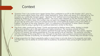 Dave's "Question Time" music video effectively conveys political messages through its representation of current affairs and direct address to the audience. It features Dave rapping in front of a camera, referencing topics like the Grenfell Tower fire and NHS crisis to critique the government. Images behind him visually support his lyrics. By maintaining eye contact with the camera throughout, Dave immerses viewers in his critique of oppression and calls for political change. His brand is also strengthened by his consistent focus in each shot, creating a recognizable face for his progressive messages.