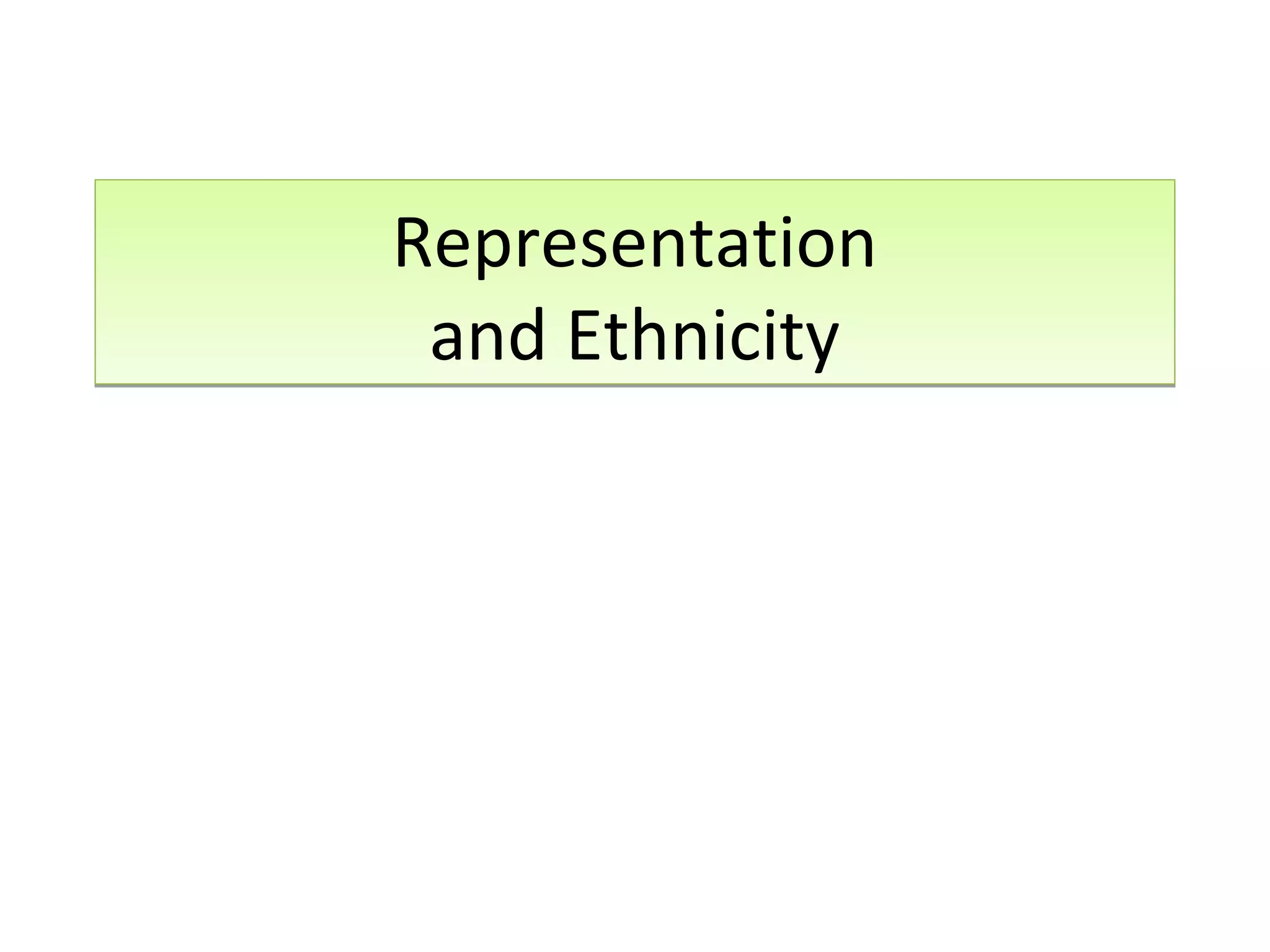 The document discusses representation of ethnicity in media. It states that ethnicity, like gender, consists of both biological and culturally defined characteristics. Media representation of ethnic groups can rely on rigid stereotypes similar to gender stereotypes. However, stereotyping of race is seen as more harmful than gender stereotypes because media may provide children's only experience of certain ethnic groups. The document also notes that most research has focused on representation of black people and that representation of other groups like Asian and Latino people is also important given their population sizes. It discusses how representation of ethnic groups has both improved and still includes negative stereotypes at times.