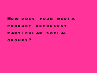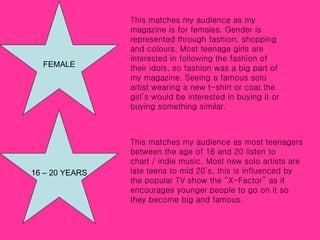 The document discusses how a music magazine represents and targets different social groups. It aims its content at teenage girls aged 16-20 by focusing on fashion and styles of popular artists. It targets the middle class by keeping the magazine price under £4.00. The magazine represents white British people through the artists featured, like Pixie Lott and Cheryl Cole, who create music in that genre.