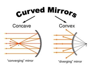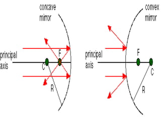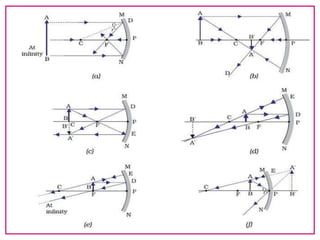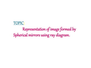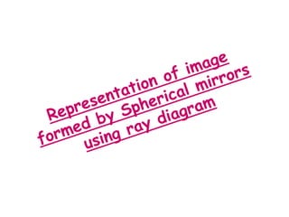 The document discusses the representation of images formed by spherical mirrors through ray diagrams, focusing on the properties of concave and convex mirrors. It explains how to locate the image of an object using specific rays that follow the laws of reflection, detailing four types of ray interactions with the mirrors. Additionally, it includes illustrations for image formation by both concave and convex mirrors at different object positions.