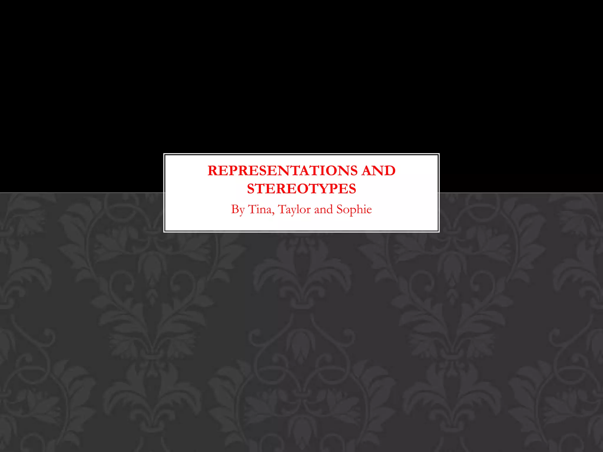 This document discusses representations and stereotypes related to gender, age, ethnicity, sexuality, class, status, physical ability, and regional identity. It notes that representations are how media portrays groups from a certain perspective, while stereotypes involve grouping things based on how they are commonly presented, mainly regarding people. Several examples are given of representations and stereotypes for each category.