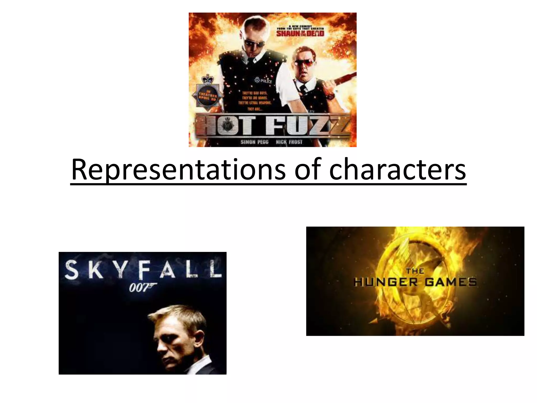 This document contains still images from The Hunger Games and Hot Fuzz depicting Jennifer Lawrence as Katniss Everdeen and Simon Pegg as Nicolas Angel in various emotional states and situations. It also contains stills from Skyfall depicting Daniel Craig as James Bond engaged in important, vulnerable, mysterious, and action-packed scenes. The stills use facial expressions, environments, camera work, lighting, costumes, and props to convey emotions and advance the plots.