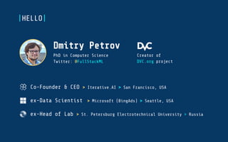 The document outlines a three-step approach to achieving reproducibility with unstructured data, emphasizing the importance of central storage for data artifacts, decoupling data from code using metadata, and being metrics-driven. It suggests using tools like DVC for version control and managing data files effectively. The author, Dmitry Petrov, provides practical examples and commands for implementing these strategies.