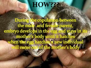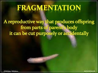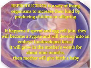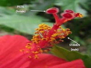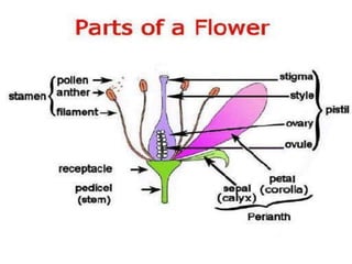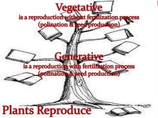 This document discusses different types of plant reproduction. It defines a perfect or hermaphrodite flower as one that has both stamen and pistil, a male flower as one with only stamen, and a female flower as one with only pistil. It then lists and describes various sexual and asexual vegetative propagation methods such as shoots, spores, tubers/bulbs, rhizomes, stolons, cuttings, grafting, layering and budding. The document also categorizes animal reproduction as either sexual, involving the production of eggs and sperm, or asexual. It notes some animals are oviparous and lay eggs, others are ovoviviparous and produce both