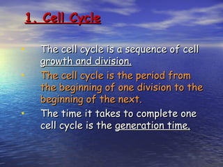 This lecture discusses cellular reproduction through the cell cycle, mitosis, meiosis, and amitosis. The cell cycle involves interphase with the G1, S, and G2 phases and the M phase of mitosis and cytokinesis. Mitosis produces two identical daughter cells through prophase, metaphase, anaphase and telophase. Meiosis reduces the chromosome number from 46 to 23 through two cell divisions to produce four haploid cells.