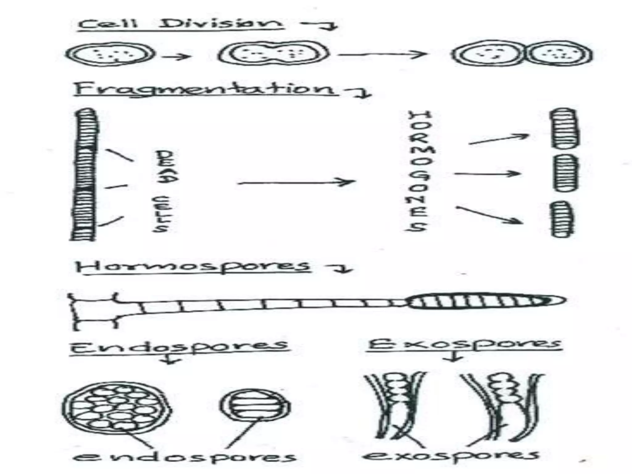 This document summarizes different types of asexual and sexual reproduction in bacteria. The main types of asexual reproduction discussed are budding, fragmentation, and binary fission. Binary fission involves the bacterial DNA replicating and the cell membrane dividing the original cell into two identical daughter cells. Sexual reproduction in bacteria can occur through conjugation, transformation, or transduction, which involves the transfer of genes between bacteria through direct contact, uptake of extracellular DNA, or bacteriophage transmission, respectively.