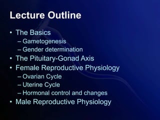 This document provides an outline for a lecture on reproductive physiology. It begins with an overview of gametogenesis and gender determination. It then discusses the pituitary-gonad axis and its role in regulating the reproductive cycles. Female reproductive physiology is examined, including the ovarian cycle, uterine cycle, and hormonal control of both cycles. Finally, it covers the basics of male reproductive physiology such as sperm production in the testes and the role of hormones.