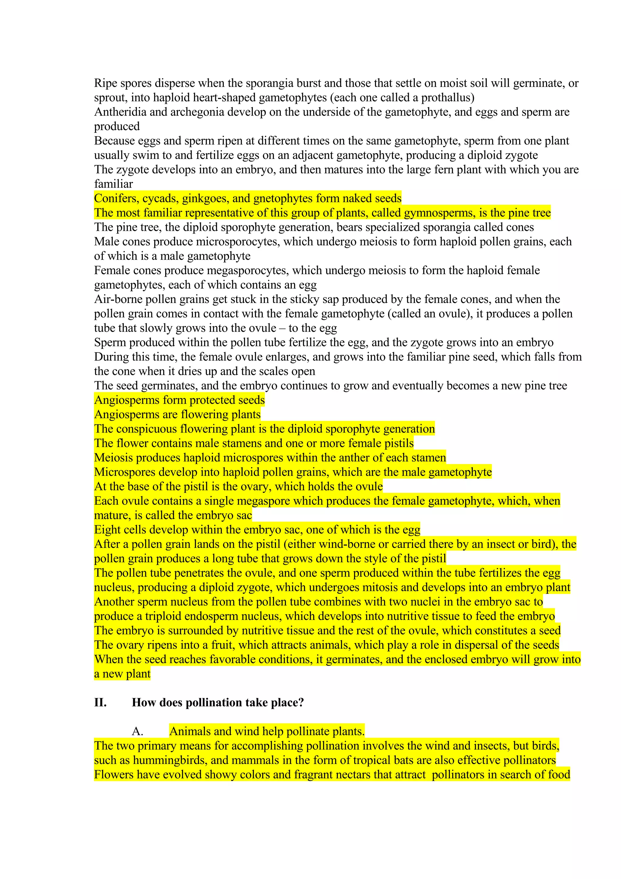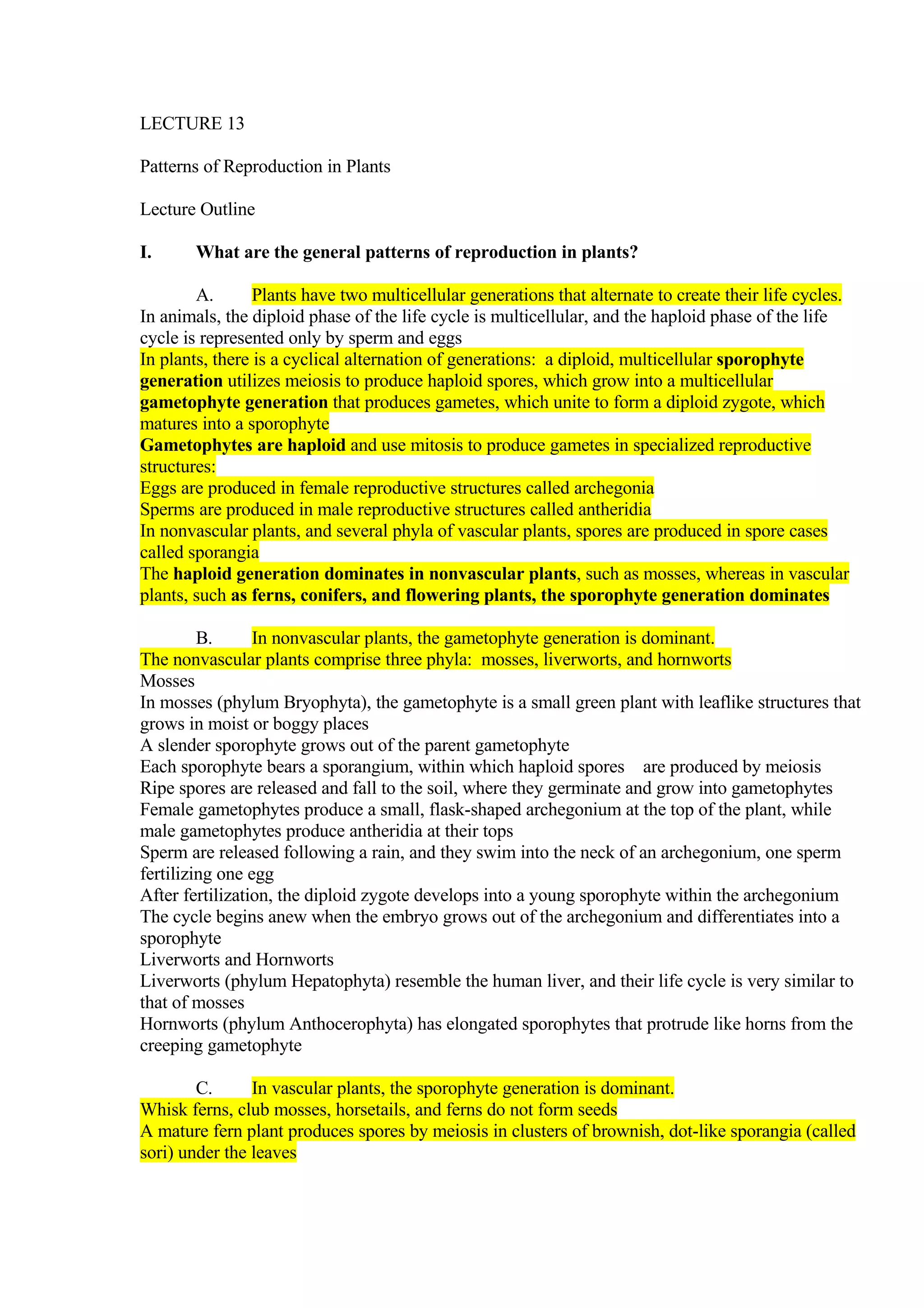 Plants reproduce sexually through a life cycle of alternating generations. In vascular plants like ferns, the sporophyte generation is dominant and produces spores through meiosis. These spores grow into smaller gametophytes that produce gametes. Fertilization of an egg cell by a sperm cell forms a diploid zygote, beginning the cycle again. Seeds develop from fertilized ovules inside fruits and are dispersed by animals, wind, or water. Germination begins when seeds absorb water and sprout. Vegetative propagation allows new plants to form from plant parts like stems, tubers, or leaves.