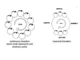 The document describes the male and female reproductive systems of dogs and rabbits. It defines key terms like fertilization, implantation, and signs of being in heat. It explains the functions of main parts like the testes, ovaries, uterus, and vagina. Hormonal changes of the menstrual cycle and how they affect the ovaries and uterus are summarized. The key differences between animal and avian reproduction are outlined. Causes and treatments of infertility in males and females are also discussed.