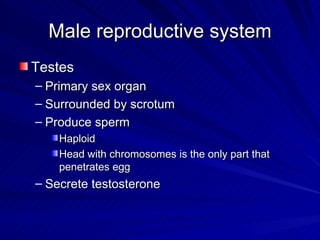 The male and female reproductive systems both produce gametes (sperm and eggs) to create offspring. The male system includes testes that produce sperm and other organs like the epididymis, vas deferens, seminal vesicles and prostate that all contribute to semen. The female system includes ovaries that produce eggs and the uterus that supports fetal development if fertilization occurs in the fallopian tubes. Both sexes develop secondary sex characteristics like body hair and voice changes in males or breast growth in females during puberty.