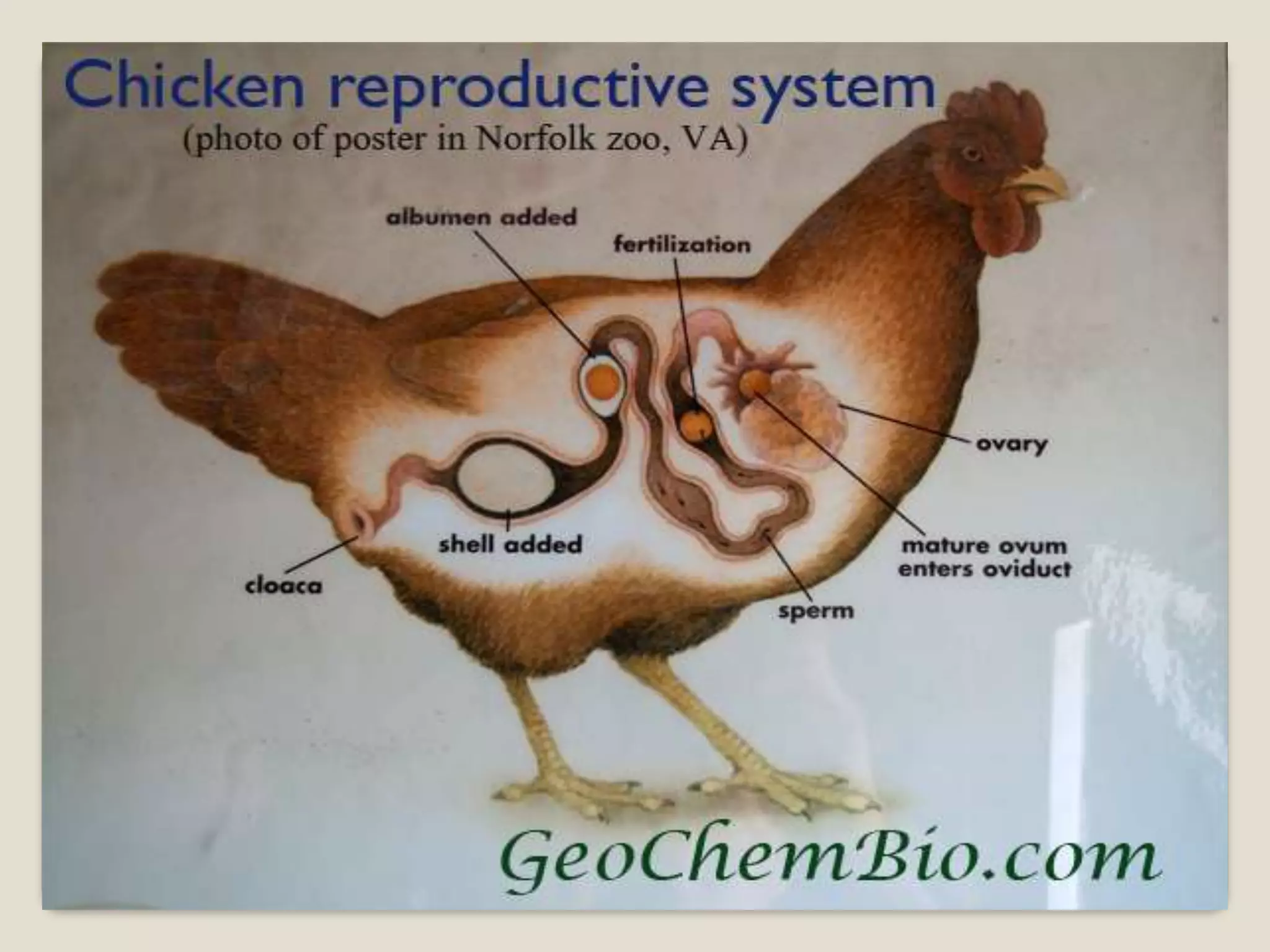The female reproductive tract of chickens consists of a pair of ovaries and oviducts. The egg travels through the oviduct over approximately 22 hours, undergoing several modifications. It passes through the infundibulum, where it is engulfed. In the magnum, albumen is deposited on the egg. The isthmus adds two shell membranes. In the uterus or shell gland, calcite crystals are deposited to form the eggshell. A protective bloom coating is applied in the vagina before laying.