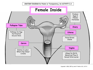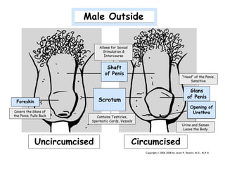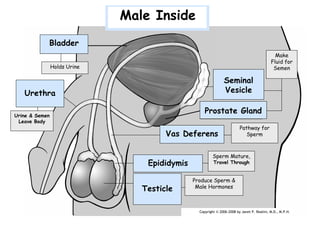 The document provides information about the male and female reproductive systems, their functions, and key parts. It describes that the main functions are to ensure survival of the species by producing egg and sperm cells, transporting and sustaining these cells, nurturing developing offspring, and producing hormones. It then details specific male functions of producing, maintaining and transporting sperm and semen, and producing male sex hormones. It also details specific female functions of producing egg cells, transporting eggs, providing a place for baby to develop, menstruating if not fertilized, and producing female sex hormones.