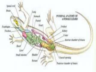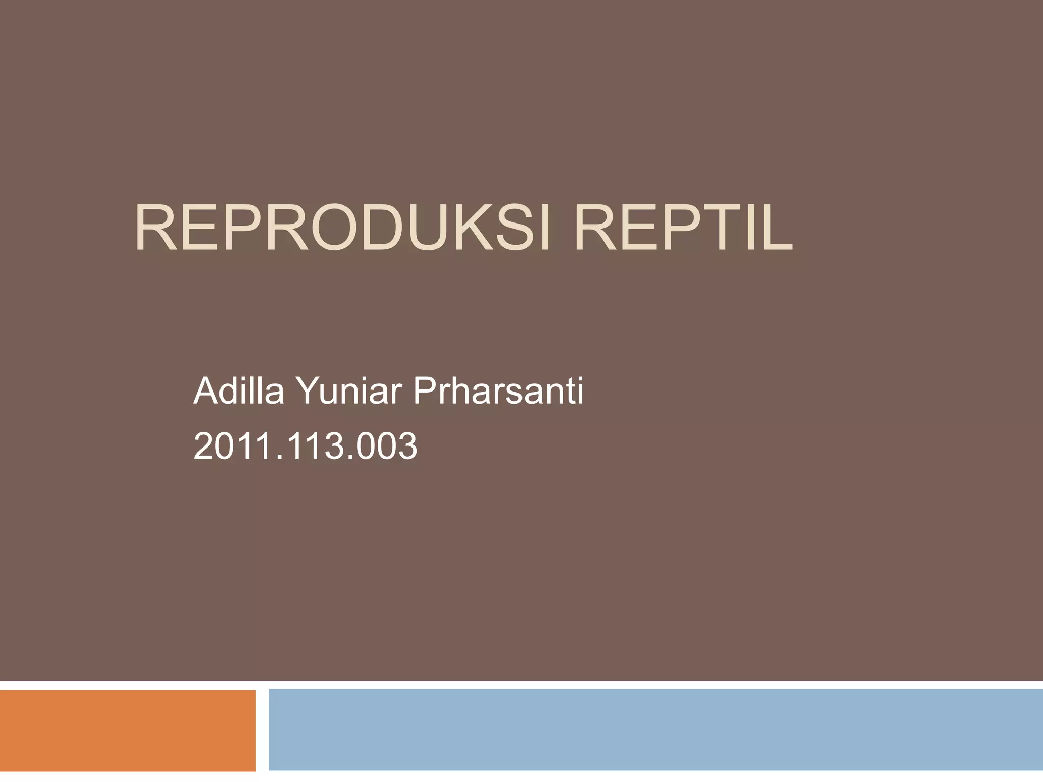 Dokumen menjelaskan alat perkembangbiakan reptil yang terpisah antara jantan dan betina, termasuk struktur seperti testis, ovarium, dan hemipenis. Mekanisme reproduksi melibatkan proses dimana ovum dari betina dibuahi oleh sperma dari jantan, diikuti dengan perjalanan ovum melalui oviduk untuk melahirkan telur yang dilindungi oleh cangkang. Telur biasanya diletakkan di tempat hangat dan ditinggalkan oleh induknya, dengan kuning telur sebagai persediaan nutrisi.