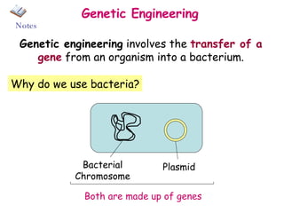 The document discusses using genetic engineering to produce human insulin in bacteria. It describes how the human insulin gene is inserted into a bacterial plasmid, which is then placed into bacterial cells. The bacterial cells grow and multiply, producing more plasmids and insulin. The human insulin is then collected and purified from the bacterial cells.