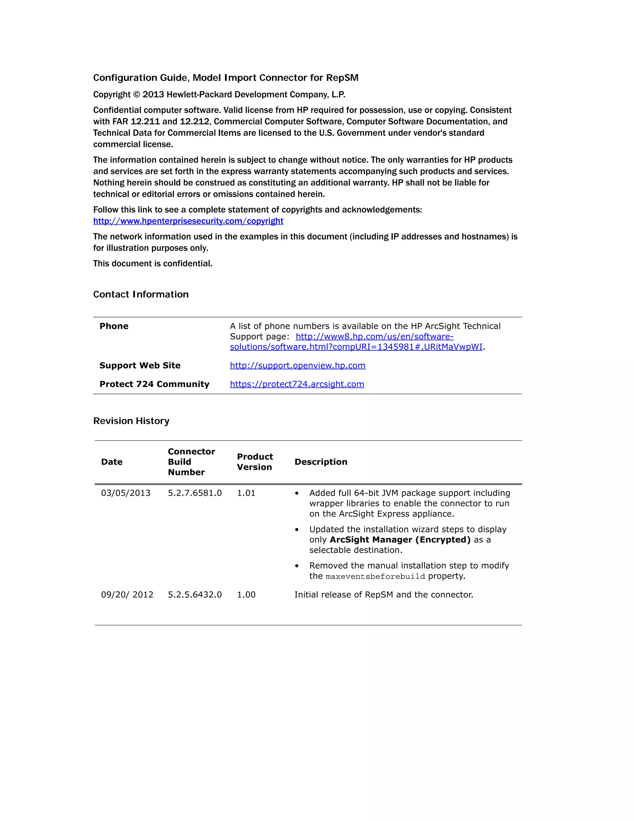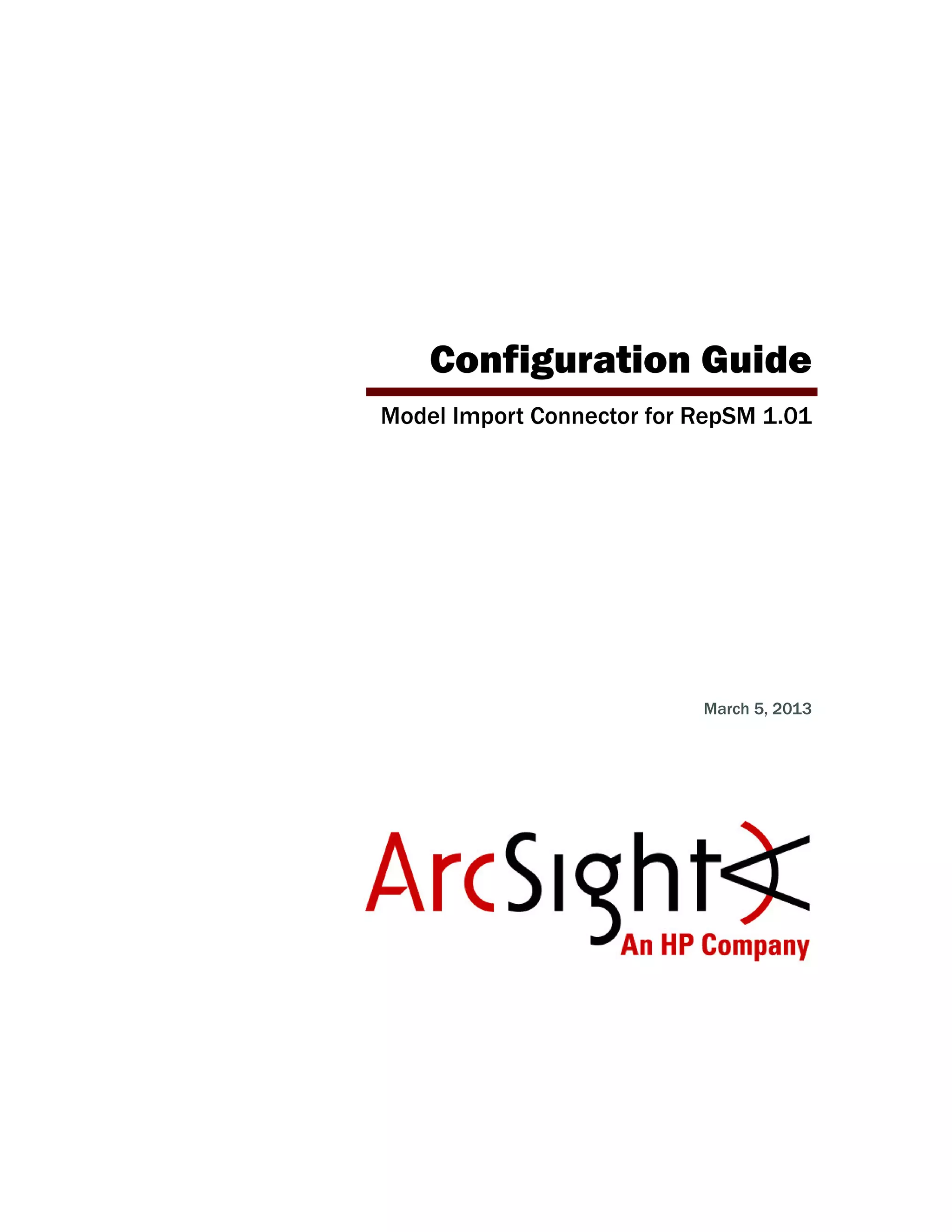 The document provides installation and configuration instructions for the Model Import Connector for RepSM 1.01. It describes downloading and running the installation wizard for the core connector software. Additional steps are then required to complete the RepSM connector installation, such as entering the service activation key and configuring the destination ArcSight Manager. The document also provides an overview of the connector's features for retrieving reputation data from the RepSM threat intelligence service and forwarding it to ArcSight ESM.