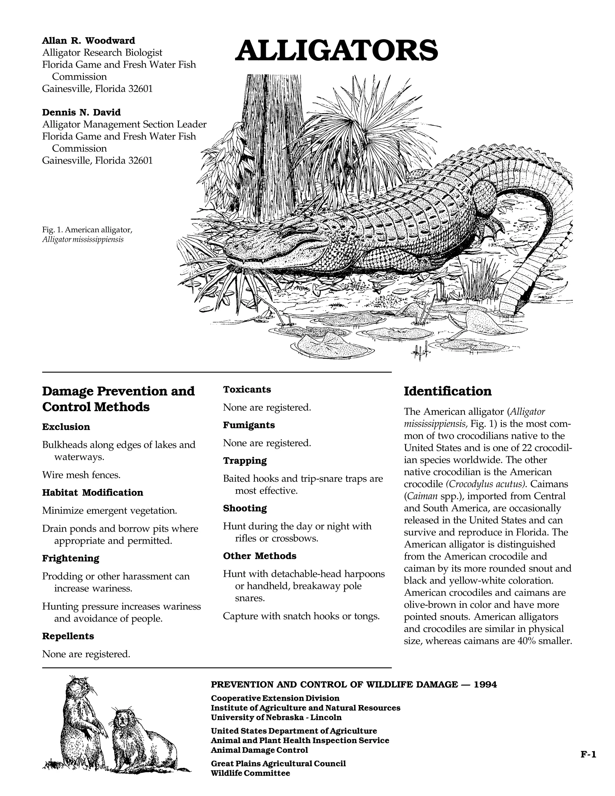 - Damage prevention and control methods for alligators include exclusion, habitat modification, frightening, trapping, shooting, and other capture methods.