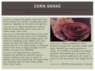 The document provides care guidelines for various reptiles and lizards, detailing their housing requirements, temperature needs, feeding schedules, and humidity levels. It emphasizes the importance of proper substrate, decorations, and nutritional needs while cautioning against toxic materials like pine or cedar. Each species listed, such as corn snakes, hognose, and blue tongue skinks, includes specific details beneficial for beginner and intermediate keepers.