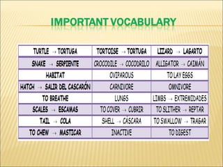 This document provides information about reptiles. It states that reptiles are vertebrates that have bones and spend most of their time on land, though some can spend time in water. Examples given are turtles, tortoises, lizards, snakes, and crocodiles. Most reptiles lay eggs on land and baby reptiles resemble adults when hatched. Reptiles breathe using lungs and have scales covering their bodies, though some have no limbs. They move by walking, running, slithering, or swimming.