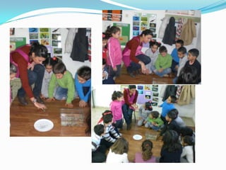 Tortoises and turtles are discussed, comparing their features and exploring how to care for a tortoise that is hungry as well as looking at turtle features and touching its shell. The document talks about working with both tortoises and turtles, comparing them, and enjoying learning about turtles.