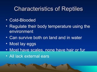 Reptiles are cold-blooded animals that can survive on land and in water. There are four main groups of reptiles: crocodiles, lizards, turtles, and snakes. Crocodiles are found in tropical environments and can stay underwater for over an hour. Lizards come in many varieties and shed their skin as they grow. Turtles have a hard shell and can retract their head inside. Snakes shed their skin several times per year as they grow and are carnivorous.