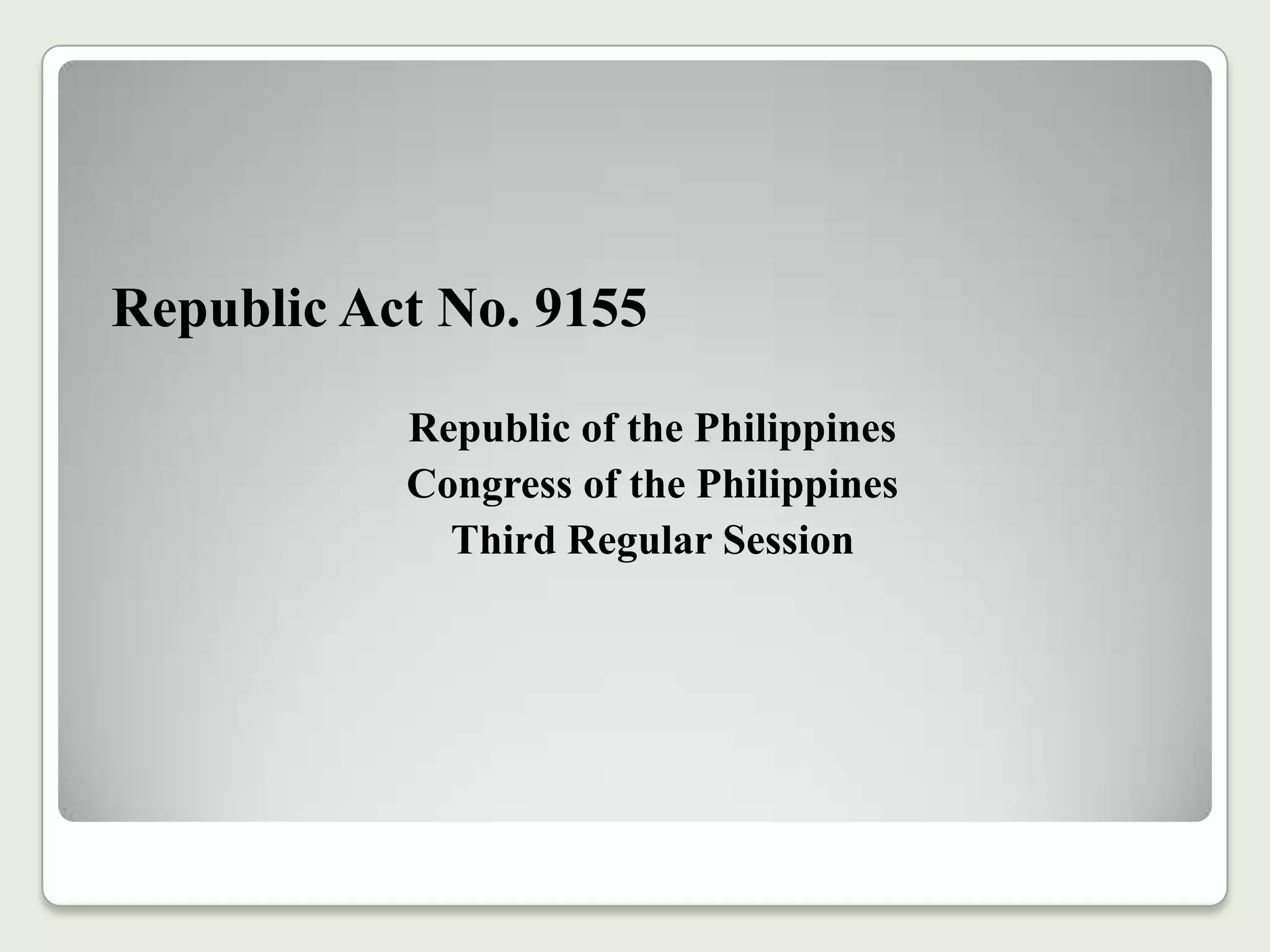 This document outlines Republic Act No. 9155, which establishes a framework for governance of basic education in the Philippines. It renames the Department of Education, Culture and Sports to the Department of Education, and transfers cultural agencies and school sports programs to other departments. The act defines roles and responsibilities at each level of governance, from national to school levels. It aims to improve access to and quality of basic education for all learners.
