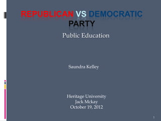 The document compares the Republican and Democratic party views on public education, outlining their general philosophies and stances on school choice and practices. Republicans are generally more conservative and support increasing parental control over education through school vouchers and tax credits, while Democrats advocate for continued federal control and funding of public schools without private school options. Key differences include the Republican support for school prayer and teaching English as the national language versus the Democratic stances on multi-lingual and multi-cultural education practices.