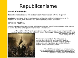 Republicanisme DEFINICIÓACADÉMICA: Republicanisme: Doctrina dels partidaris de la República com a forma de govern. República: Forma de govern representativa, en la qual el càrrec de cap d’estat no és hereditari ni vitalici, sinó resultat d’una elecció popular, directa o indirecta . DEFINICIÓ POLÍTICA: Entenem per República la comunitat política de ciutadans sobirans fonamentada en el dret i el bé comú. Republica s’ha oposat historicament a monarquia. “ Res publica vol dir “cosa del poble”, entenent que poble no es qualsevol conglomerat d’homes reunits de qualsevol manera, sinó una reunió de gent associada per l’acord d’observar la justícia i amb una comunió d’interesos” Ciceró, De republica, III.32 Principi fonamental de la República serà la llibertat, entesa com la no dependència de la voluntat arbitraria d’un home o d’alguns homes i exigeix respecte rigurós del govern de la llei, la igualtat dels drets civils i polítics. “ Un poble lliure obeeix però no serveix; ré caps, però no amos; obeeix les lleis, però tan sols les lleis, i és gràcies a les lleis que no esdevé servidor dels homes” J.-J. Rousseau, “Lettres écrites de la montagne”