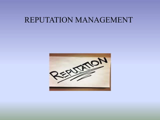 This document discusses reputation management. It defines reputation as the beliefs or opinions generally held about someone or something. Reputation management is the practice of understanding and influencing how an individual or business is perceived. Maintaining a good reputation provides benefits like attracting customers and employees. The reputation management process involves building, maintaining, and recovering reputation. Strategies for addressing reputational damage depend on whether the organization has a good or bad existing reputation. Overall, reputation is important for long term business success.