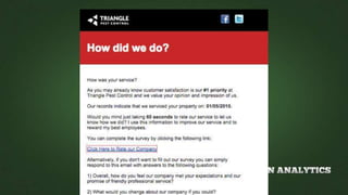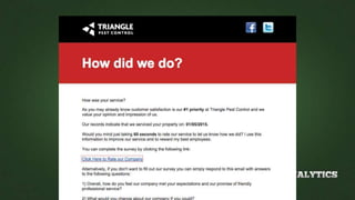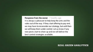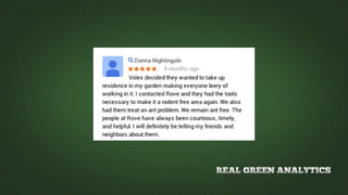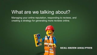 This document discusses reputation management and generating online reviews. It recommends businesses check their online reputation by searching for themselves online and setting up alerts. The document outlines a seven step process for incentivizing and generating more positive reviews, including ensuring good customer service, claiming business pages, incentivizing reviews, and highlighting reviews on a website. It also cautions that responding respectfully to negative reviews is important and not to artificially generate reviews.