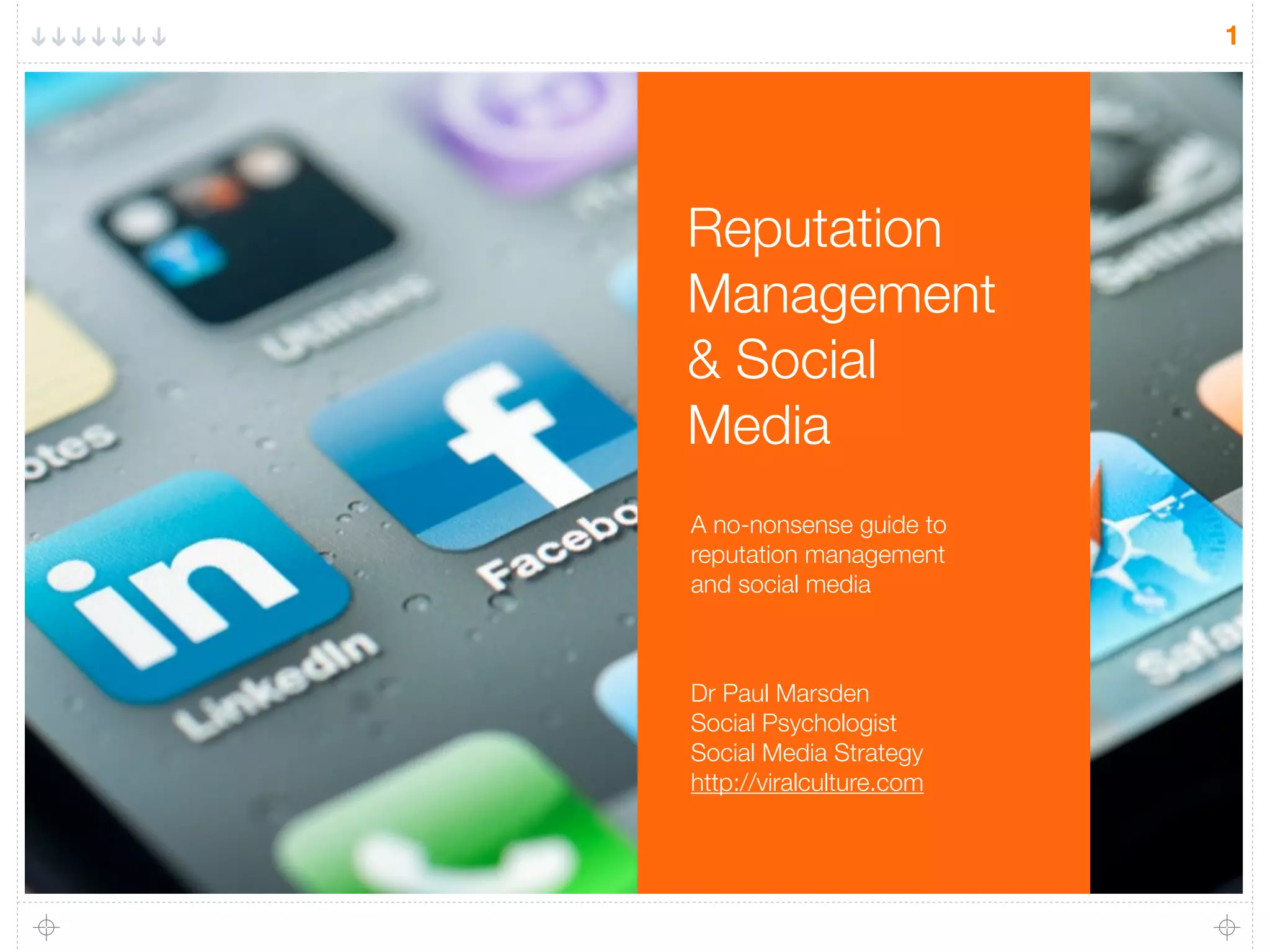 This document provides an overview of reputation management and online reputation management. It discusses how reputation is defined as the collective representation of what others say about an organization over time. Reputation is important for organizational success, and those with strong reputations grow faster. The document outlines several strategies for online reputation management, including delivering valuable digital services, managing online visibility through sites like Google and social media, and providing helpful, real-time information during crises. It emphasizes that reputation cannot be manufactured but must be earned through consistently meeting and exceeding customer expectations.