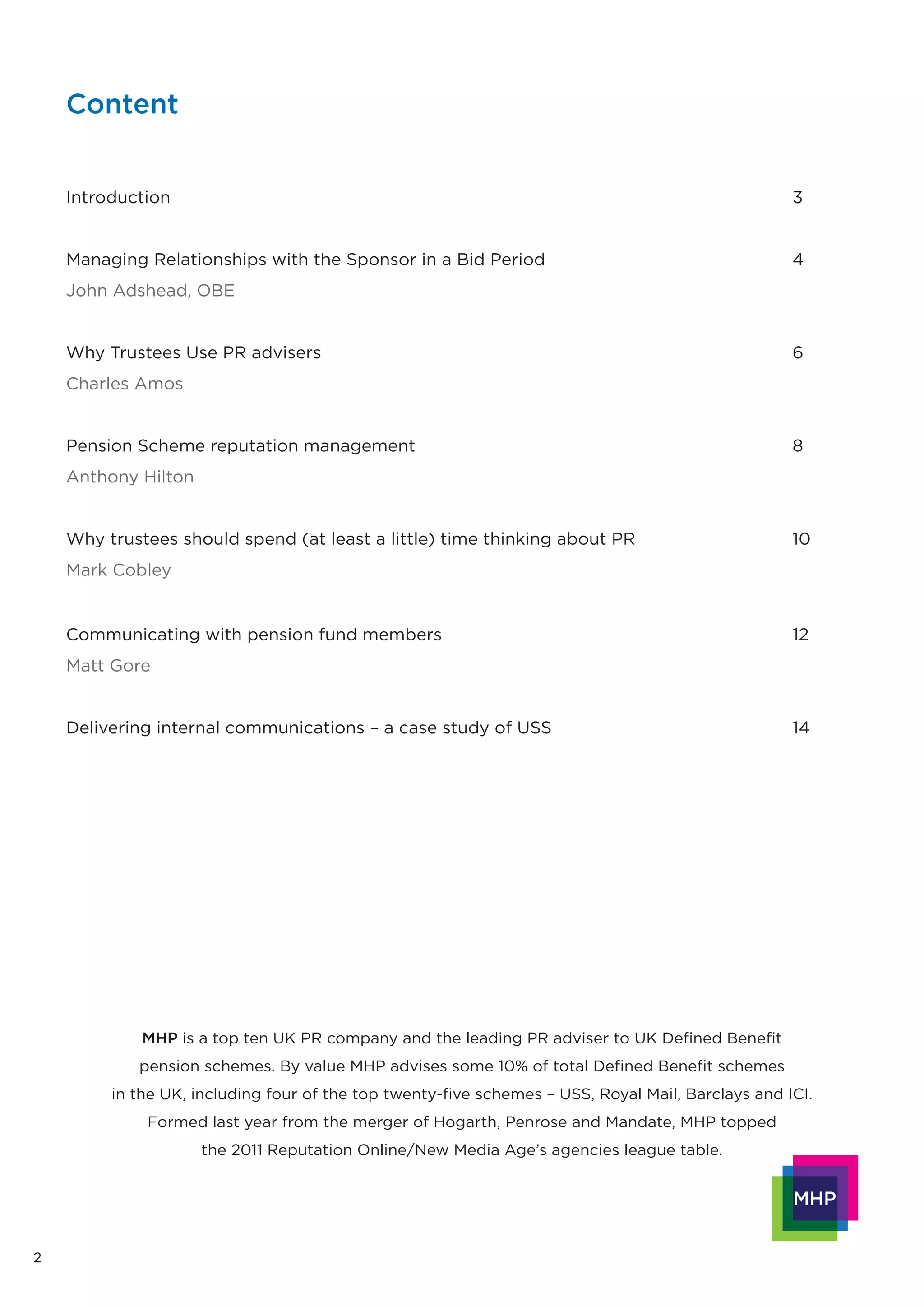 The document discusses why pension trustees may use public relations (PR) advisers. It notes that while businesses need satisfied customers to grow, pension trustees' main goal is to discharge their liabilities, not grow them. However, PR advisers can help trustees protect their most valuable asset - the employer's commitment to fund the pension scheme. During corporate changes like takeovers or restructuring, pension funds can be ignored, so PR helps trustees articulate their position to ensure members' interests are considered. The article provides arguments for why trustees should consider PR to safeguard their scheme when employers' interests may diverge from members' during periods of corporate change.