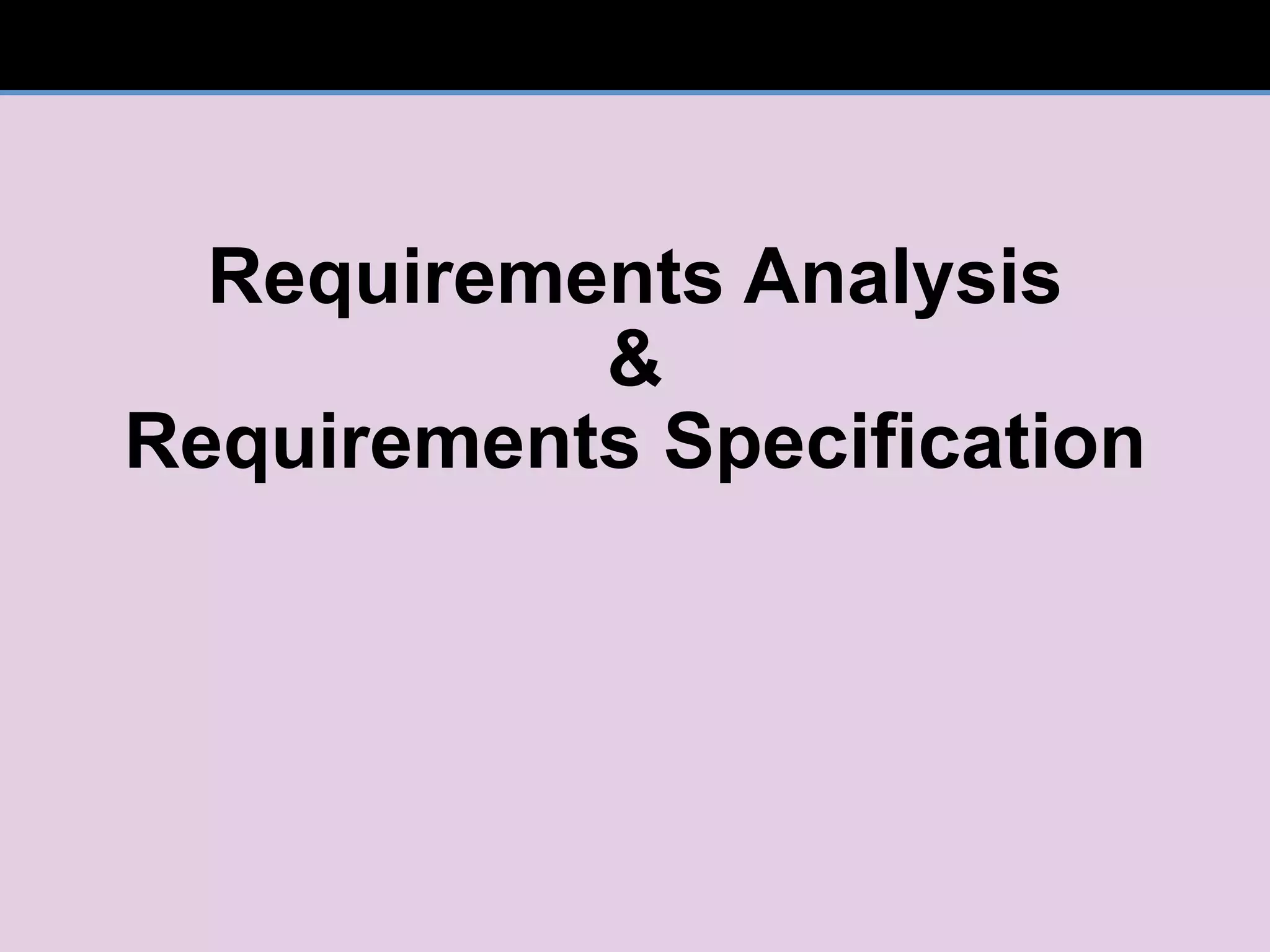 The document discusses requirements engineering and analysis. It defines requirements elicitation, analysis, and specification. The goal of requirements analysis is to study user needs to define software requirements. A requirements specification precisely describes required functions, performance, constraints, and quality attributes. It also discusses types of requirements, the difference between requirements and design, and quality attributes.