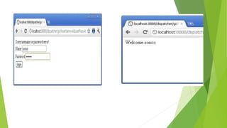 The RequestDispatcher interface in Java allows servlets to dispatch or forward requests to other resources on the server like HTML files, JSP pages, or other servlets. It provides two main methods - forward() to forward a request and include() to include the response of a resource in the current response. The getRequestDispatcher() method of the ServletRequest interface returns a RequestDispatcher object that can then be used to call the forward() or include() methods, passing the request and response objects. An example is provided of a login servlet that uses RequestDispatcher to forward successfully authenticated requests to a welcome servlet or include an error message on failed authentication.