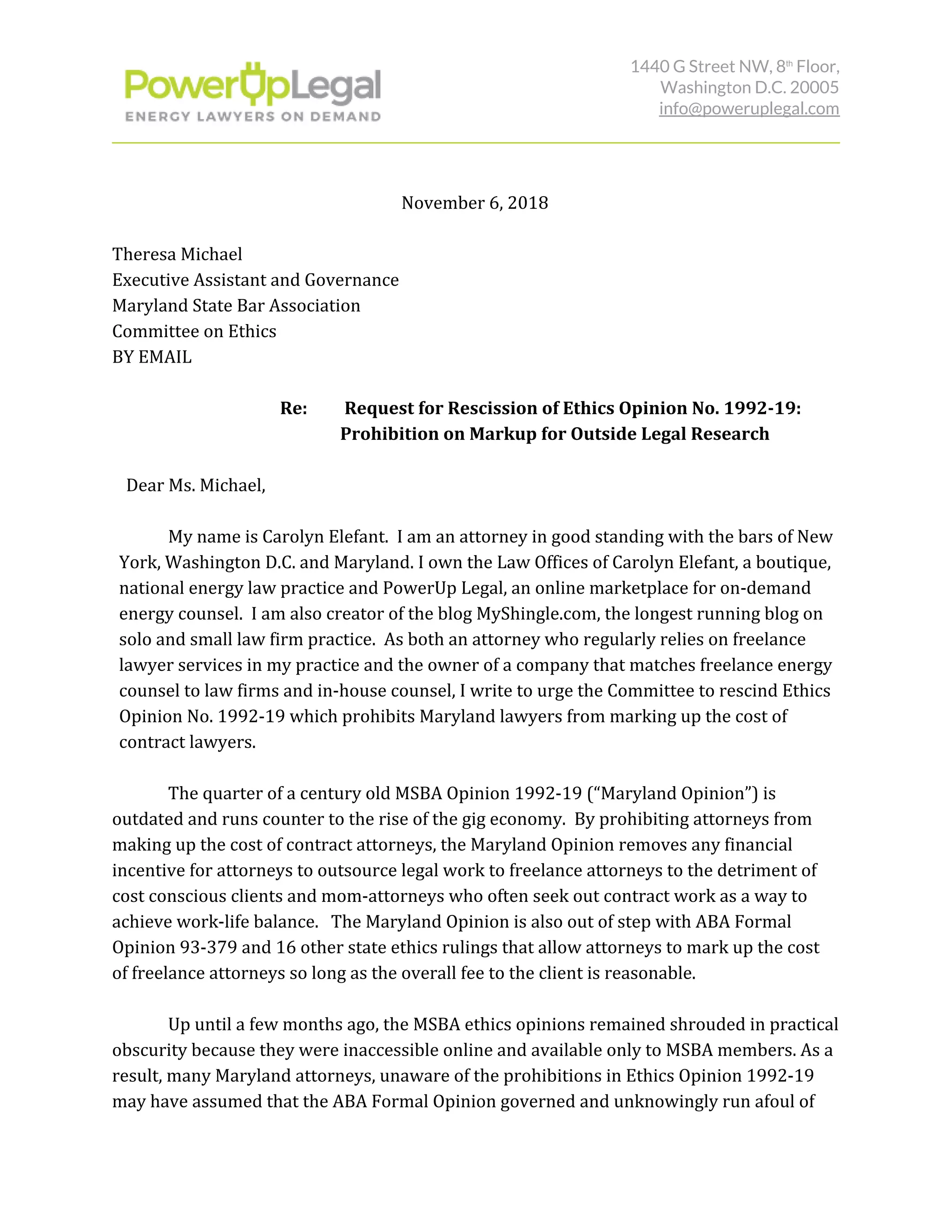 Carolyn Elefant, an attorney who owns a boutique energy law practice and freelance legal marketplace, writes to request that the Maryland State Bar Association rescind its 1992 ethics opinion prohibiting lawyers from marking up the costs of freelance attorneys. The opinion is outdated as the legal profession has embraced freelance arrangements and the gig economy. Allowing markups benefits clients through lower overall rates, solo and small firm lawyers by incentivizing the use of lower-cost freelancers, and freelance attorneys by providing them work opportunities. Most other ethics authorities, including the ABA, permit reasonable markups. Rescinding the opinion would bring Maryland in line with the modern legal industry while supporting cost-effective and flexible legal services.