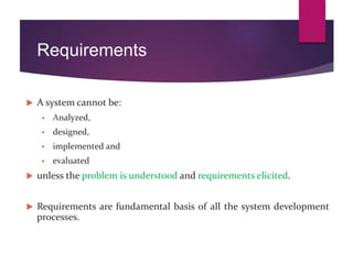 The document discusses system requirements and requirements engineering. It defines requirements as statements that identify the essential needs of a system. There are various types of requirements including functional requirements, which describe what a system should do, and non-functional requirements, which define properties like usability, reliability and performance. The requirements life cycle involves eliciting, organizing, analyzing and documenting requirements. Requirements must be traceable, necessary, unambiguous and testable.