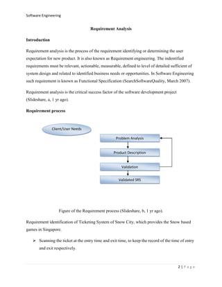 This document discusses the requirement analysis and software development methodology selection for developing a ticketing system called the Snow City System. It analyzes the requirements of the system, which include scanning tickets, calculating charges based on time spent, notifying customers of charges, and generating reports. It evaluates various software development methodologies and determines that the fourth generation techniques methodology is most appropriate due to its features around non-procedural languages, report generation, data manipulation, and screen interaction that map well to the system requirements. The document also discusses various dependability measurement attributes that are relevant for the system, including reliability, efficiency, integrity, maintainability, and availability.