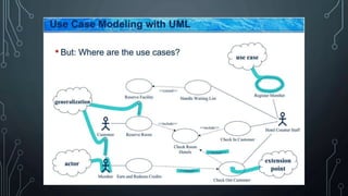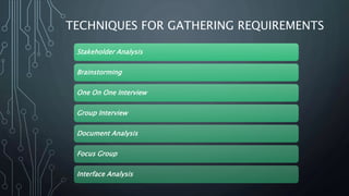 The document discusses various techniques for requirements elicitation, which involves gathering system requirements from stakeholders. Techniques include stakeholder analysis, interviews, brainstorming, document analysis, and surveys, each with their own benefits and drawbacks. The text emphasizes the importance of selecting appropriate methods based on the context to ensure comprehensive and accurate requirement gathering.