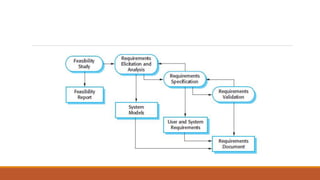 The document discusses the process of requirements engineering, which involves gathering, analyzing, documenting, and validating system requirements that reflect customer needs. It defines user and system requirements, differentiates between functional and non-functional requirements, and outlines steps for feasibility studies, requirements elicitation, validation, and management. Effective requirements documentation is critical for successful software development and must ensure clarity and completeness to reduce costly rework during the development process.