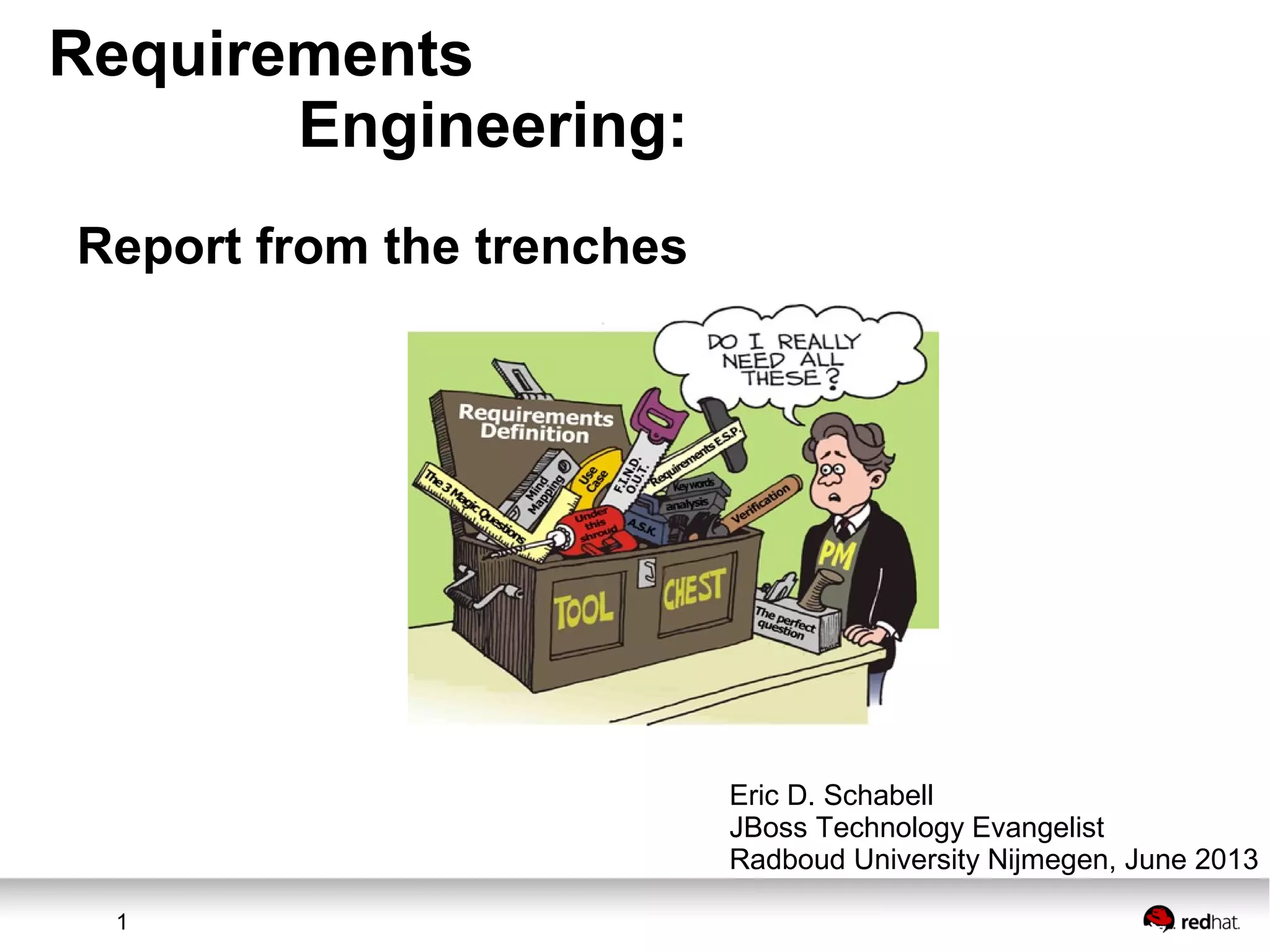 The document summarizes the realities of requirements engineering based on the author's experiences working on projects at a bank. It describes how ideal processes break down in reality due to business pressures, technical challenges, and lack of resources. This is illustrated through examples of developing web services and business processes for savings product applications. While practices are improving, the author notes legacy decisions can continue to impact new projects.