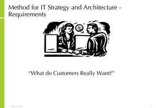 The document discusses requirements gathering and management methodology. It defines methodology as a body of practices used in a discipline. Requirements methodology captures, synthesizes, verifies and manages customer requirements. There are two key outputs: an objectives and requirements specification and an optional functional specification. The methodology involves gathering, analyzing, reviewing, assessing, capturing and changing requirements. It should be used anytime a project has customer requirements and be tailored to each specific project.