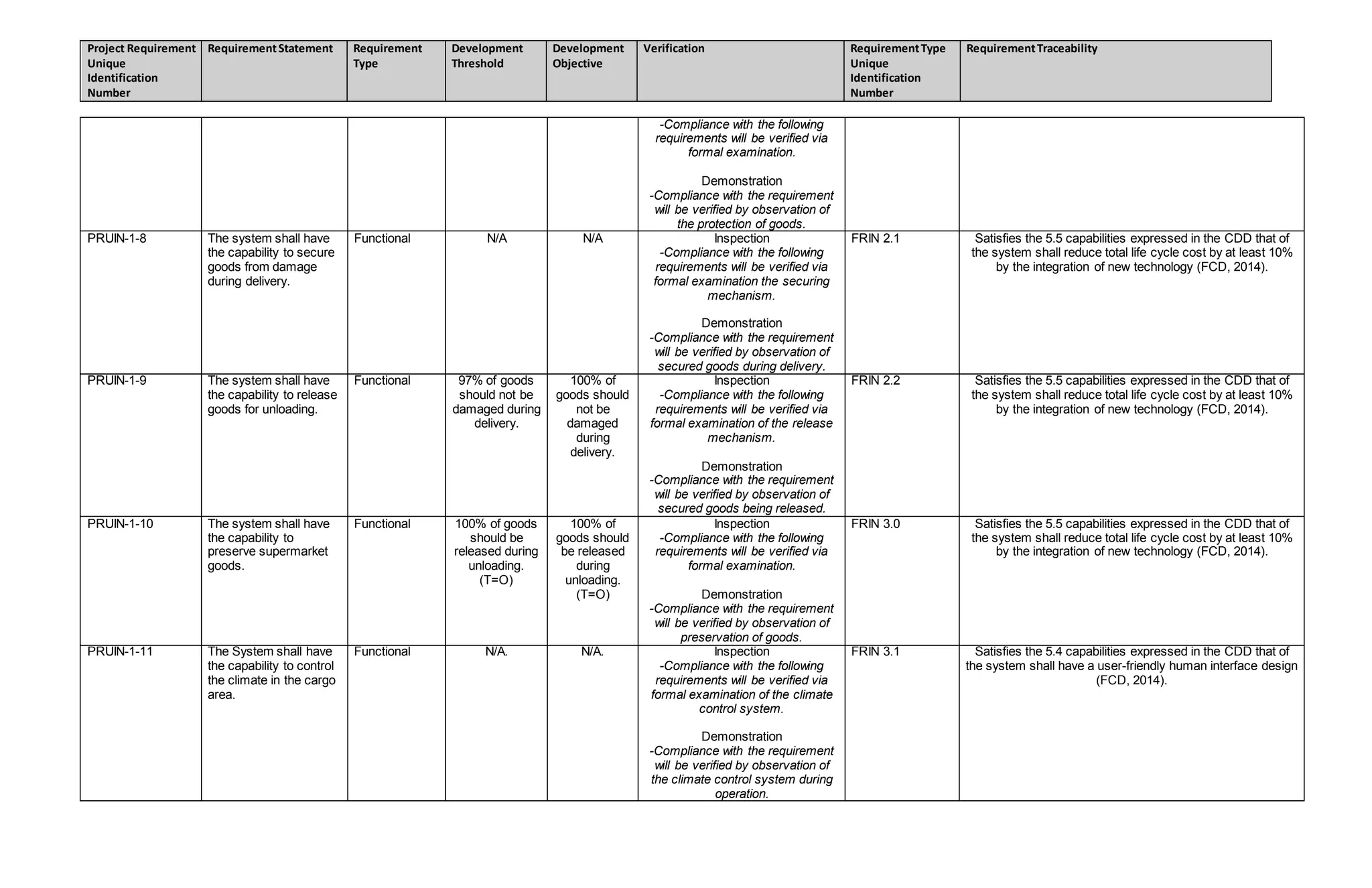The document outlines 18 project requirements for a system to transport supermarket goods. Each requirement specifies a unique identification number, requirement statement, requirement type (functional), development threshold, development objective, verification method, and traceability to other requirements. The requirements specify capabilities for the system such as loading, weighing, lifting, storing goods at various temperatures, protecting, securing, releasing, preserving goods, and controlling climate in the cargo area including adding or removing heat to maintain specified temperature ranges and rates of temperature change.