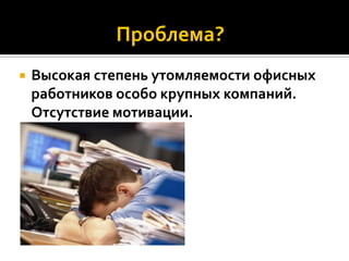 Документ описывает концепцию создания клуба для офисных работников, направленного на повышение их мотивации и работоспособности через спортивные и расслабляющие мероприятия. В нем рассматриваются различные аспекты бизнес-модели, включая целевую аудиторию, прогнозы доходов и анализ конкурентов. Основное предложение включает абонементы на услуги клуба и зону здорового питания, а также стратегию маркетинга и управления клиентами.