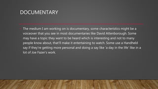 The document discusses characteristics of documentaries including voiceovers and focusing on interesting topics not widely known. It mentions Joe Fazer, a fitness YouTuber known for 5 minute videos focusing on bodybuilding and powerlifting. Key benefits of exercise for the brain and body are outlined. Facts are provided about distorted body image views leading to dangerous habits. Statistics are given on anabolic steroid use in the UK. Interviews were conducted about action movies. Reflections were shared on conducting interviews. Existing documentaries on bigorexia and bodybuilding are summarized. Planned experiments and audience research are outlined.